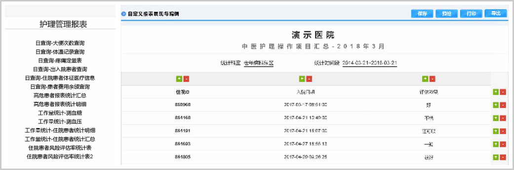 系統(tǒng)內(nèi)置具有高度可配置性的自定義報(bào)表功能,不僅支持查詢分析類報(bào)表更加可以實(shí)現(xiàn)基于報(bào)表的二次錄入和實(shí)時(shí)編輯,充分滿足護(hù)理統(tǒng)計(jì)預(yù)分析的個(gè)性化需求