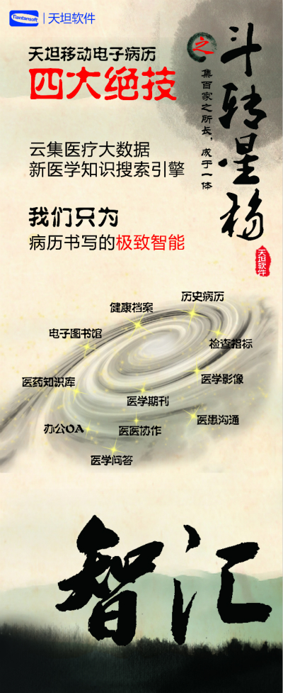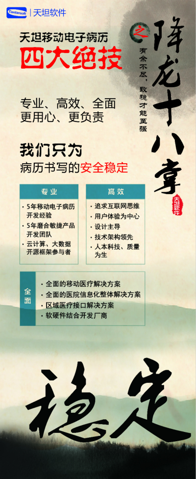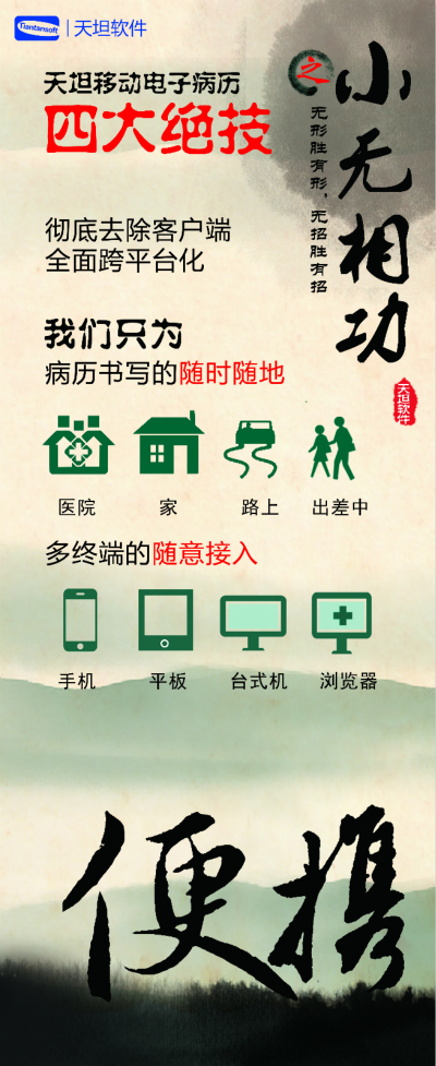 天坦軟件,作為國內移動電子病歷的先行者,盛裝亮相京交會。在會上展示了以“天坦移動電子病歷”為核心的醫(yī)院整體信息化系統(tǒng),受到眾多參觀者的關注。天坦軟件始終堅持以“讓天下沒有難看的病”為宗旨,致力于醫(yī)療事業(yè)發(fā)展。為中國醫(yī)療衛(wèi)生行業(yè)的信息化建設以及個人健康服務提供從硬件到軟件、從技術到服務的全面解決方案,是中國醫(yī)療信息化市場中快速成長的獨立軟件廠商之一。數年來,一直堅持研發(fā)以移動電子病歷為核心的醫(yī)院信息化系統(tǒng),從移動框架的病歷編輯器到跨平臺的移動醫(yī)療解決方案,為整個病歷信息化行業(yè)注入了極強的創(chuàng)新活力。 “天坦移動電子病歷”為核心的醫(yī)院整體信息化系統(tǒng)秉承“高效應用、信息互通”的基本理念,是專門為醫(yī)院設計開發(fā)的醫(yī)療信息化系統(tǒng)的核心組成部分。具有高效、安全、穩(wěn)定、易用、移動、智能等特點,除此之外,還具有穩(wěn)定、完全跨平臺運行、功能強大、系統(tǒng)性能卓越等巨大優(yōu)勢。