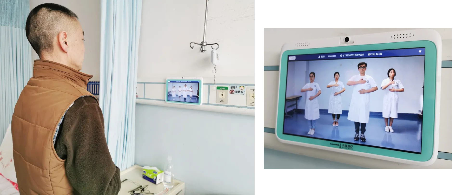 在市中心醫(yī)院心胸外科病房,剛?cè)朐旱牧质迨逭龑?duì)著病床床頭的電子屏幕跟著醫(yī)護(hù)人員一起做呼吸訓(xùn)練操……林叔叔因肺部結(jié)節(jié)入院準(zhǔn)備手術(shù),術(shù)前術(shù)后的呼吸訓(xùn)練能幫助他快速康復(fù),“以前我們會(huì)把患者集中組織起來教他們做呼吸訓(xùn)練操,但是可能學(xué)一次就忘了,現(xiàn)在我們把這些健教視頻放在患者床頭的電子屏上,患者可隨時(shí)可以點(diǎn)進(jìn)去跟著練習(xí),”護(hù)士長(zhǎng)李金學(xué)介紹,“除此之外,林叔叔還可以通過這塊屏幕實(shí)現(xiàn)診療計(jì)劃查詢、床旁掃碼繳費(fèi)、費(fèi)用明細(xì)查詢……以后我們還想利用這套信息系統(tǒng)完成床旁結(jié)算,患者從住院到出院,在病房就能一站式完成。”