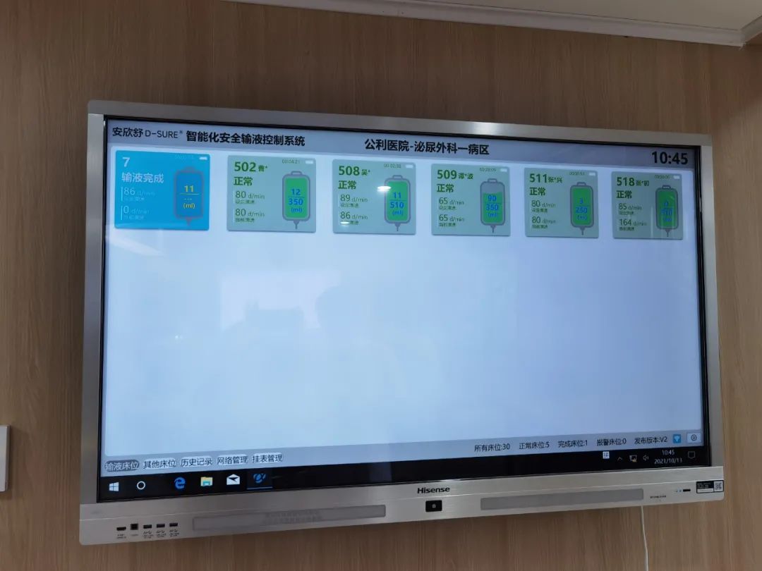 確定了用哪種輸液監(jiān)控技術(shù),變成“智慧輸液”卻還需要一個(gè)信息化工程,這就是信息護(hù)士產(chǎn)生的原因。以智慧輸液為例,要讓輸液信息“跑”起來(lái),就要一張“網(wǎng)”——具象地看就是智慧病房的7個(gè)屏:病床有兩個(gè)屏,大屏功能很多,不但可以看視頻、叫護(hù)士……還可以完成出院結(jié)算;小屏就是以前床頭的“小白卡”,顯示患者姓名、護(hù)理級(jí)別等。護(hù)士站有三個(gè)屏,一個(gè)大屏是輸液控制屏,顯示全病區(qū)的輸液情況;另外一個(gè)大屏相當(dāng)于寫字板,就是護(hù)士站常見的手寫黑板的“升級(jí)版”,除了即時(shí)更新醫(yī)囑外,還可以在病房看到正在做的手術(shù)情況等;此外還有護(hù)士站管理屏。再加上走廊屏、房間屏,所有的信息一次輸入、全程“跑動(dòng)”。